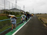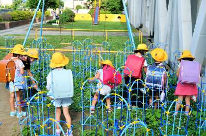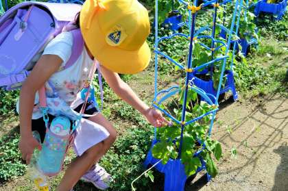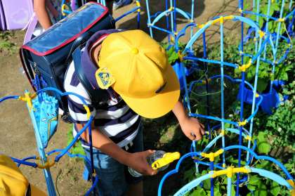 最初のアサガオのつぼみを発見。紫色のつぼみです。これから、みんなのアサガオにもたくさんのつぼみをつけ、大きな花を咲かせてくれるでしょう。