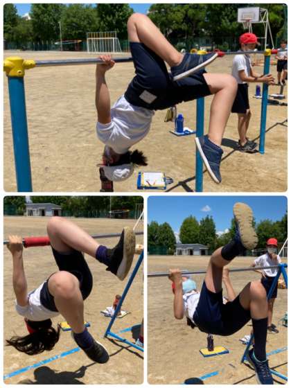 体育の授業で鉄棒の発表会を行いました。これまでの練習を生かして姿勢よく技を披露することができました。6年生の運動場での体育はこれで一区切りです。