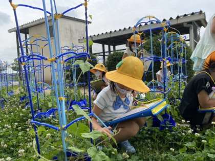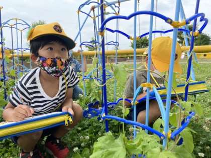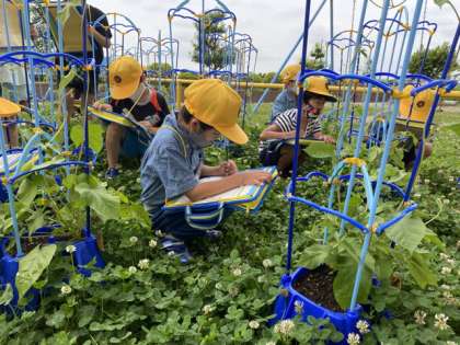 今日は、アサガオの観察をしました。前まではなかったつるがどんどん伸びて、自分の身長を越しているアサガオもありました。触ってみたり、においを嗅いでみたりして、アサガオの成長を確かめていました。どんな花を咲かせてくれるのか、楽しみですね。