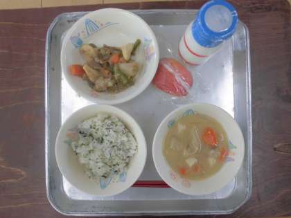 どんがら汁は、たらを使用した山形県の郷土料理です。たらをぶつ切りにして鍋に入れ、野菜や豆腐などをみそで煮込んで作る料理で、給食では、たらは角切りのものを使います。いも煮も山形県で昔から食べられている郷土料理の一つです。