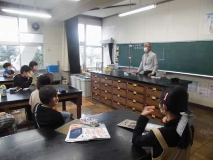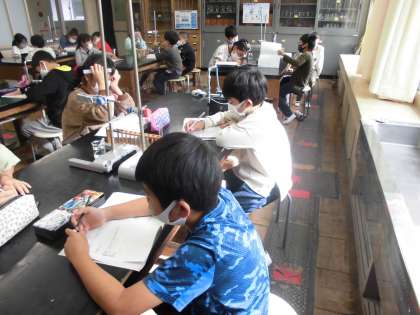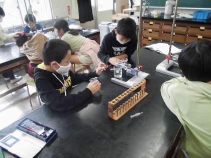 理科室で水の体積の実験をしました。水を冷やすと体積がどうなるのか確かめる実験です。まず器具の扱い方の説明を聞き、予想をノートに書いたうえで、実験に取り組みました。わずかな水面の変化を見逃さないよう、真剣に試験管を見つめていました。