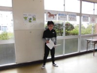 明日から始まる「赤い羽根共同募金」の呼びかけを行いました。いつ始まったのか、どんな目的で募金をしているのか劇やクイズをまじえて児童会役員が説明をしました。