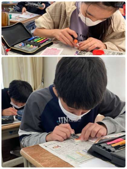 書写の作品に使用するための、自分の名前のはんこを作成しました。普段の書写の授業のように、落ち着いて取り組みました。できたはんこを試しながら、納得のいく作品に仕上げました。