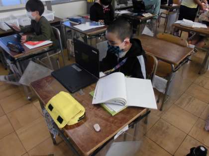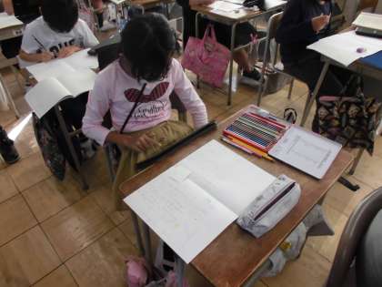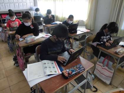 4年生の国語では伝統工芸品に関する文章を学習しています。その一環として、伝統工芸品の良さについて紹介するリーフレットの作成をしています。本やタブレットを活用して伝統工芸品について調べ、絵や写真を使いながら魅力について紹介する文章を考えていました。