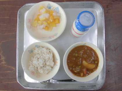 今日のカレーは、ビーフ(牛肉)とビーンズ(大豆)が入っています。大豆は、今日のように蒸して柔らかくしたものをそのままの形で料理に使うこともありますが、豆腐や油揚げ、豆乳、きな粉などさまざまな姿に形を変えても食べられています。
