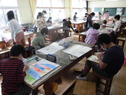 今日の図工は読書感想画の仕上げをやりました。文章からイメージを膨らませて自分なりの感想画が出来上がっていました。クレパスやクーピーを使って仕上げをしている児童もいました。来週はみんなの絵の鑑賞を行う予定です。