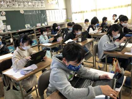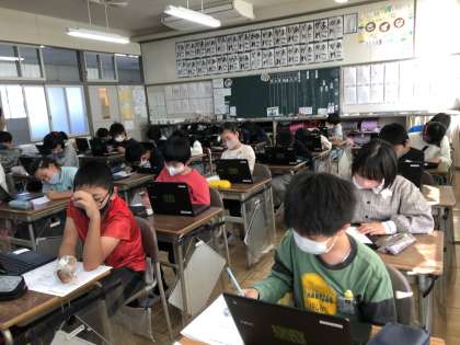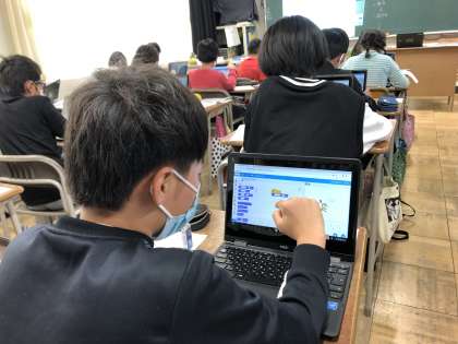 プログラミングについて学習を進めています。今日は自分の生活をプログラミングの考え方で表したり、スクラッチの用語や動かし方について学習したりしました。自分がプログラムしたことで、スプライトが動く様子に歓声があがり、楽しみながら進めることができました。