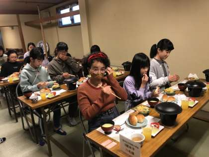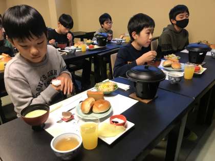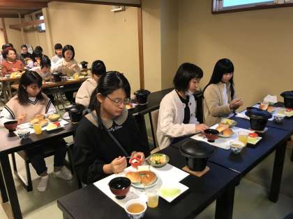 朝食は、洋食です。みんな元気です。今日は、清水寺、金閣寺、太秦映画村を見学します。今日も暖かそうです。