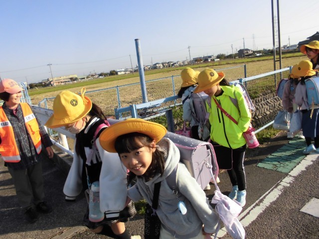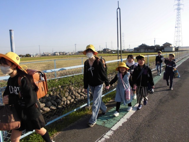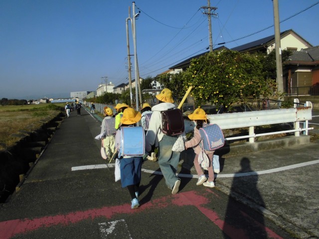 班の高学年が、低学年の子の安全を気遣って登校中です。