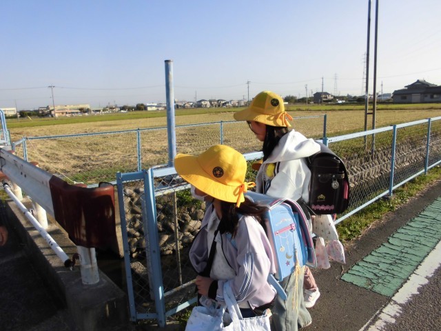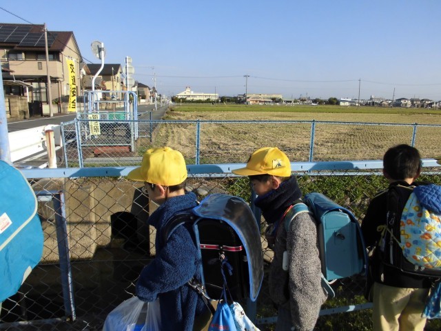 稲刈りの終わった田んぼ道の通学路。