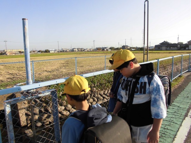 用水路に大きなカメが泳いでいるのを見つけて、みんなで眺めています。