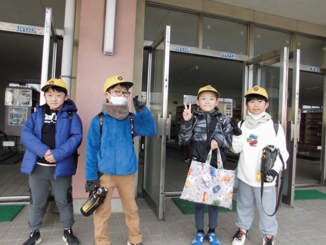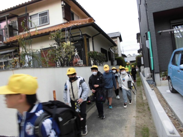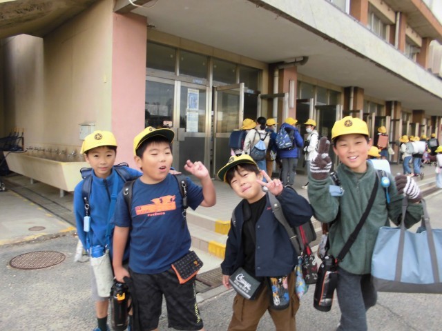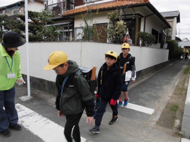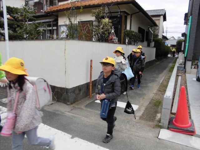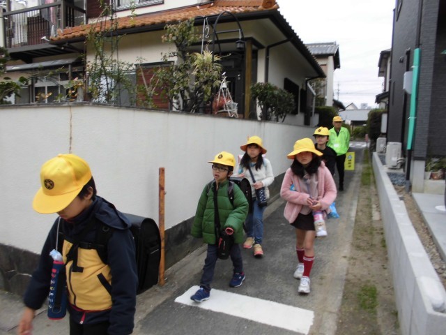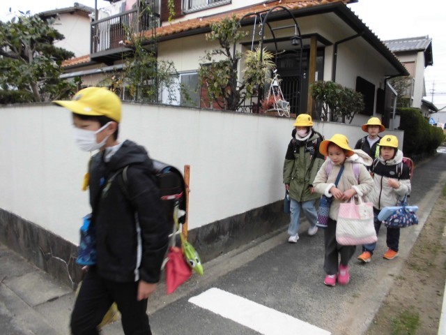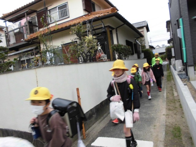 班の高学年が、低学年の子の安全を気遣って登校中です。