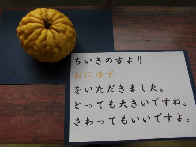 また、地域の方からはとても大きな「鬼柚子」をいただきました。子どもの顔ぐらいの大きさです。