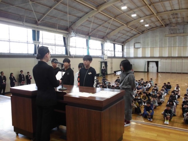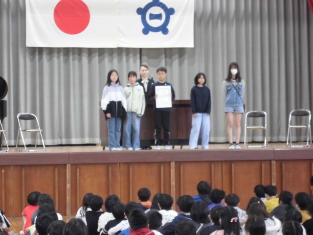 前期児童会役員任命式を行いました。入学式から代表として活躍をしてくれています。学校の代表として責任をもって務めてくれることを期待しています。また、大和南Aのバレーボールチームはクラブ交流大会で第二位の成績を残したので、表彰を行いました。これからもがんばってくださいね。