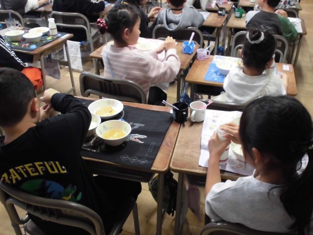 また、生活の授業では新1年生が体験入学できてくれるので、一緒に作る予定のおもちゃを作りました。紙コップけん玉を作りました。みんな、わくわくしながら作り、完成したら、一生懸命練習する姿が見られました。