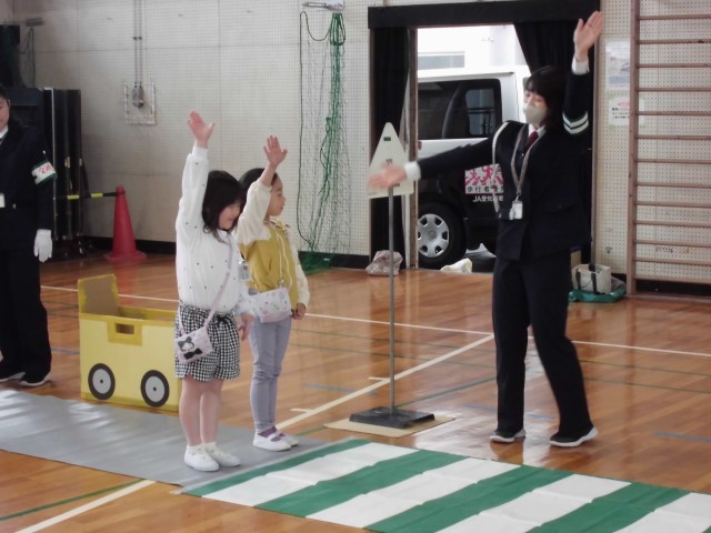 交通安全教室が行われ、道を歩くときに気を付けることを教えていただきました。体育館に信号や横断歩道を準備していただき、そこを実際に安全を確かめながら歩きました。これからも大切な命を守るため、今日教えていただいたことにいつも気を付け、落ち着いて行動してほしいと思います。