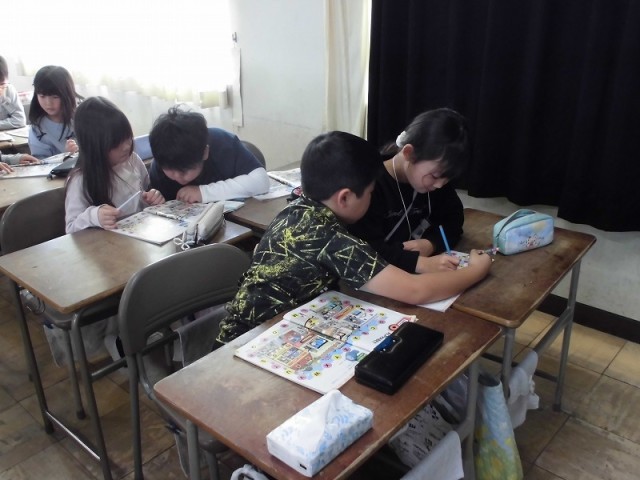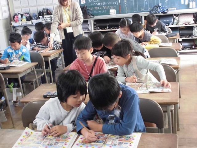 3年生の社会の授業は「地名探し」から始まります。最初に先生が指定した地図帳のページを開き、そこから問題が出されます。子ども達は問題の地名を探すのですが、すぐ見つけるときもありますが時間がかかるときもあります。いつも真剣に地名探しに取り組んでいます。