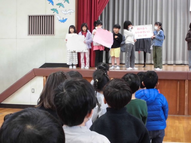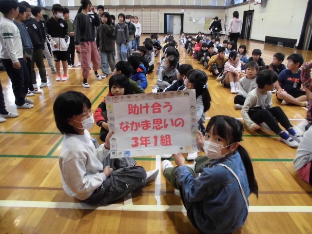 人権週間(12月4日~10日)に先立ち、今朝、人権集会を行いました。集会の内容は「人権に関する学級のスローガンの発表」と「人権講話」でした。3年生のスローガンは「助け合う なかま思いの 3年1組」です。3年生の生活もあと4か月です。スローガンのようなクラスを目指していきたいと思います。