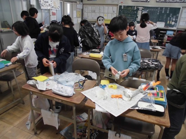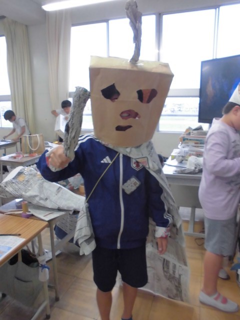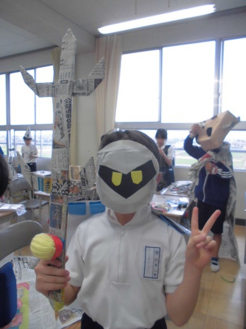 4年 +1 今日はハロウィンだったので、クラスで仮装用の衣装を作りました。 マントや帽子、ステッキ、お面等工夫を凝らして楽しんでいました。