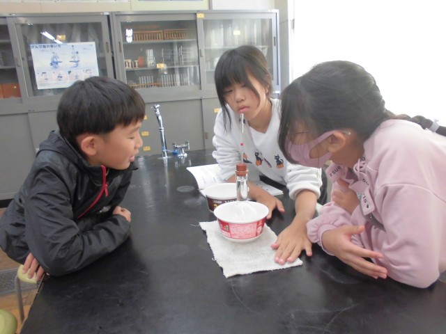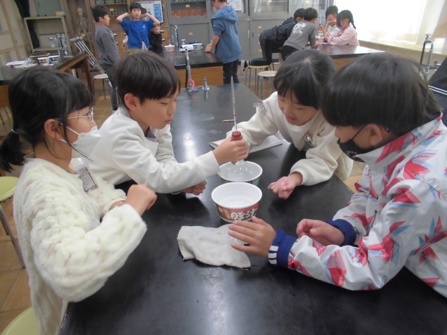 今日は理科で空気や水を温めたり、冷やしたりして体積の変化を調べました。