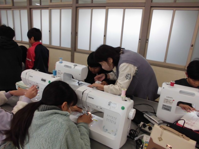 5年生家庭科のエプロンづくりでは、今日もおおぜいのボランティアの皆様に支援をしていただきました。