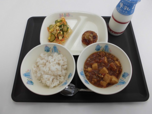 今日の献立は、麦ごはん、牛乳、マーボー豆腐、にらまんじゅう、はるさめサラダです。