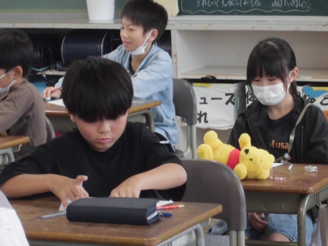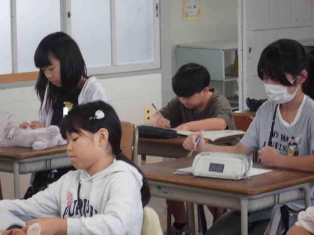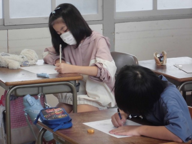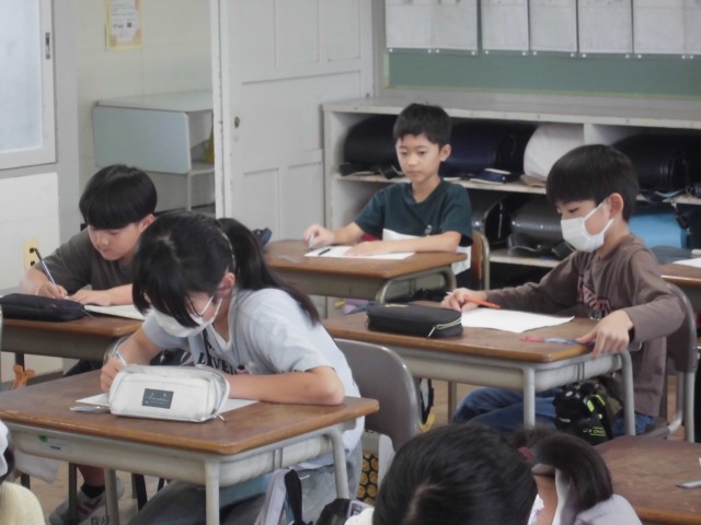 読書感想画に取り組みます。4年生は課題図書に挑戦します。先生による読み聞かせの後、お話を聞いて感じたことをワークシートにまとめました。それをもとにして、アイデアスケッチを行いました。