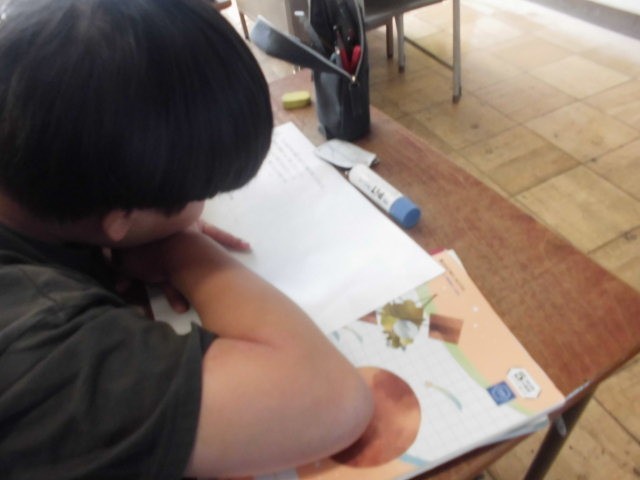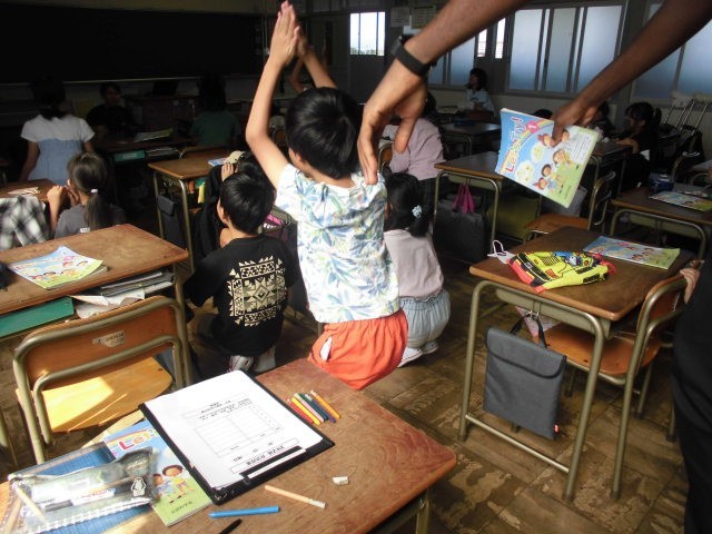 5年生は英語。「in」「on」おサルの絵を見ながらどの単語を使うか考えます。