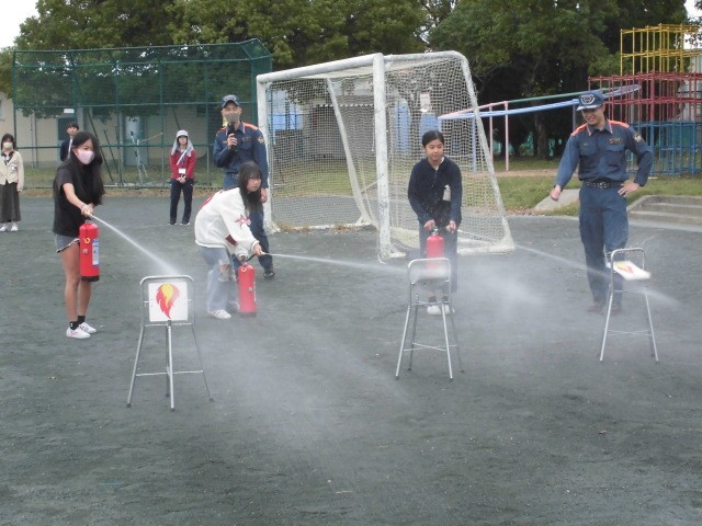 その後、水消火器の実演をしました。いざというときに、すぐに使用することができるように、使用方法を教えていただきました。
