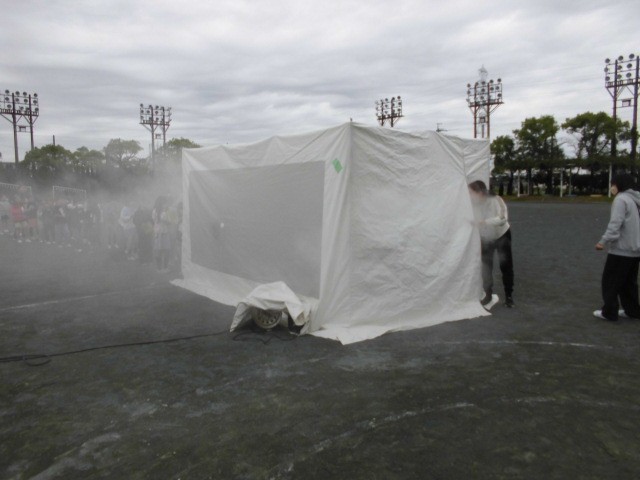 最後に、スモークハウス体験をしました。煙が充満しているところでは、前が見えません。そのようなときに、姿勢を低くしたり、壁をつたったりして進むことを教えていただきました。