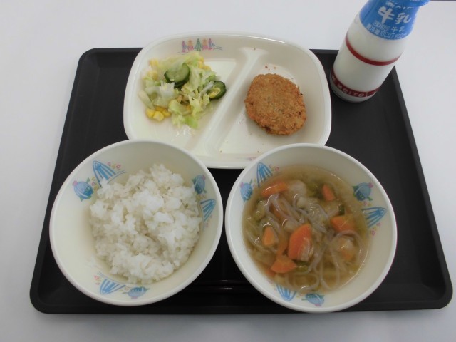 今日の献立は、ごはん、牛乳、ミンチカツ、塩だれサラダ、とり団子汁です。