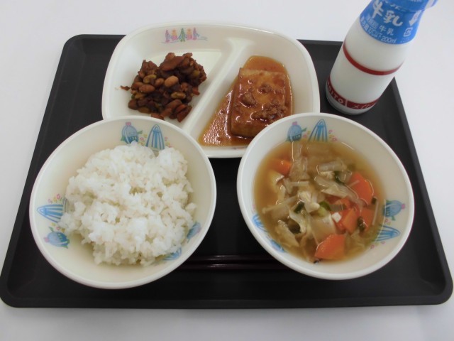 今日の献立は、ごはん、牛乳、絹厚揚げのそぼろあんかけ、鉄火みそ、湯葉のすまし汁です。