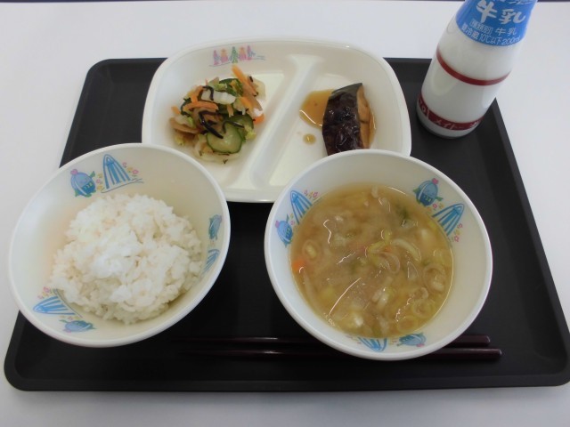 今日の献立は、ごはん、牛乳、はまちの照り焼き、つぼ漬和え、さつまいものみそ汁です。