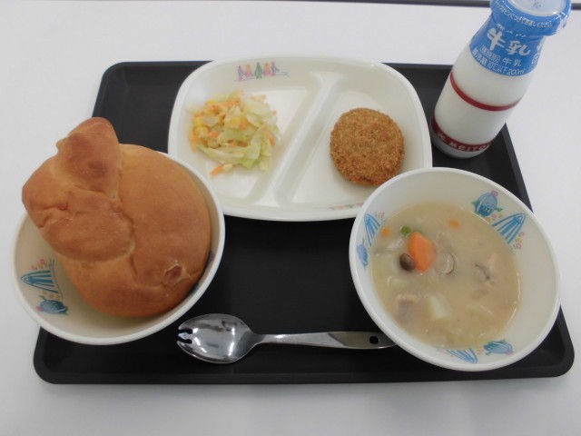 今日の献立は、りんごパン、牛乳、かぼちゃひき肉フライ、コールスロー、クリームシチューです。