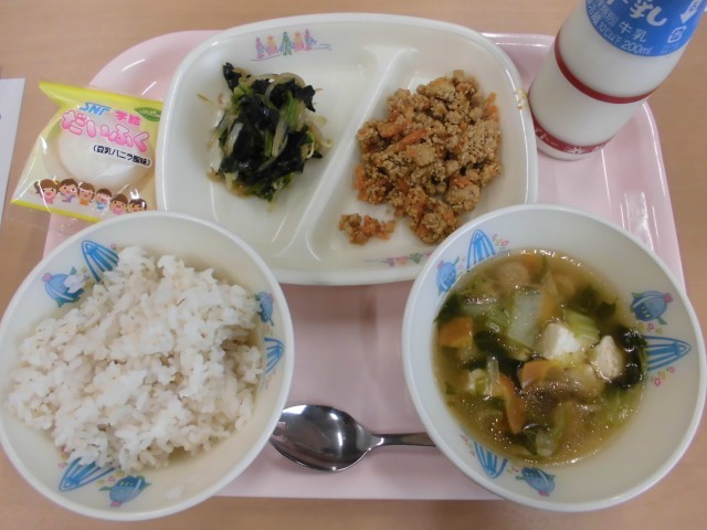 今日の献立は、麦ごはん、牛乳、ビビンバの具、ビビンバの野菜、キムチスープ、セレクトデザート(豆乳だいふくor青りんごゼリー)です。