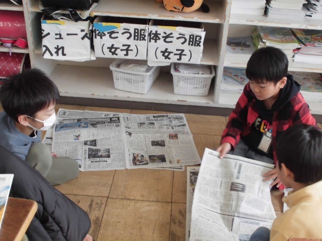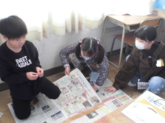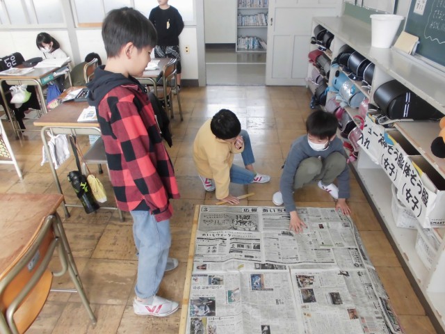 1㎡がどのくらいの広さなのかを確かめました。新聞紙を使って、たて1m、横1mにつなげて1㎡を作りました。実際の広さを体感したり見たりすることで、量感を養うことができました。