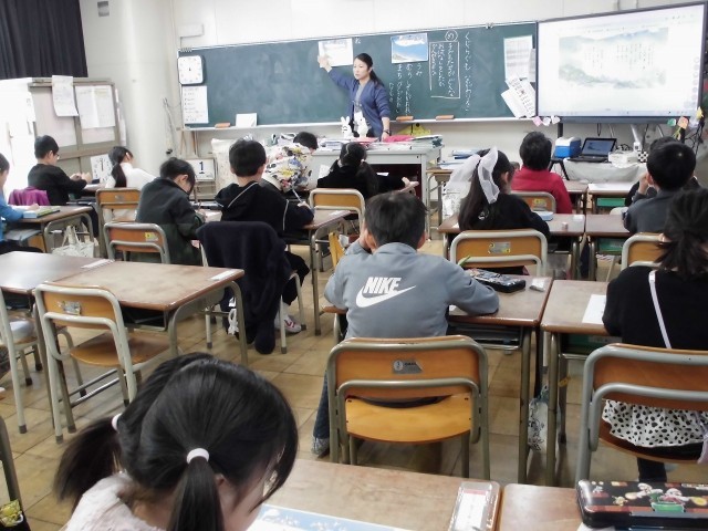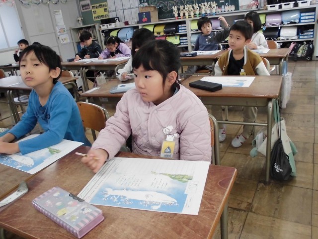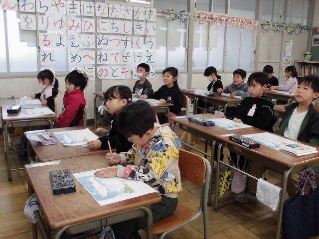 おはなしに出てくる人が何をしたかを絵を見ながら思い浮かべています。