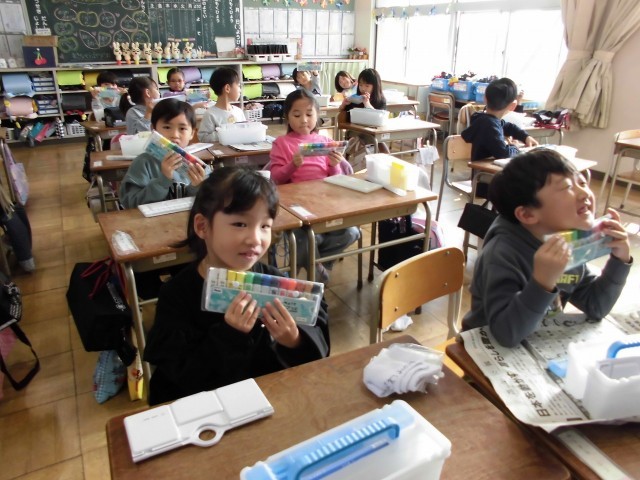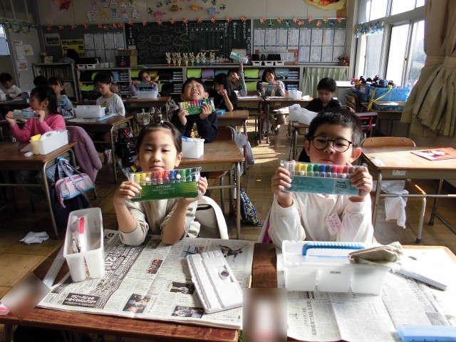 新しい絵の具を手に みんなにこにこ いい笑顔。