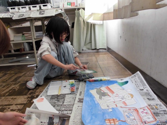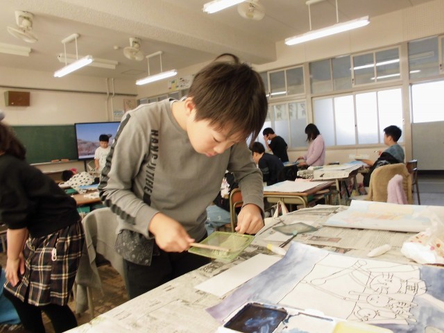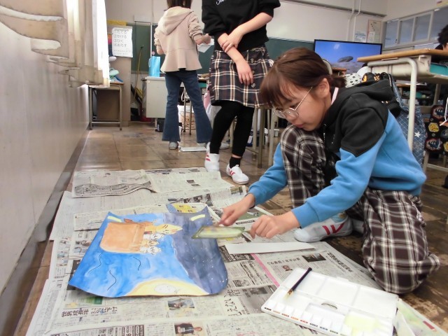 スパッタリングという技法を用いて、星空や雪の降る様子を表しています。