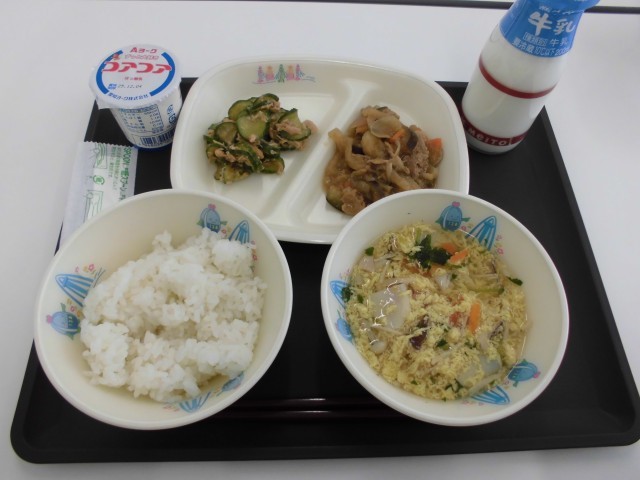 今日の献立は、ごはん、牛乳、梅味ぶたこまだいこん、きゅうりのツナ和え、かきたま汁、ヨーグルトです。