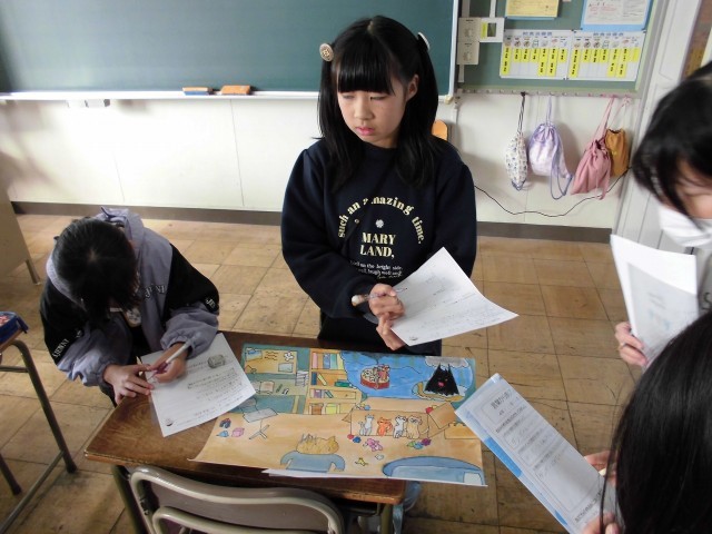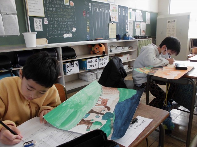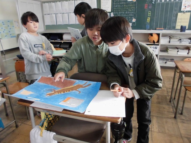 自分の作品をふりかえったり友達の作品のよいところを見つけたりしています。