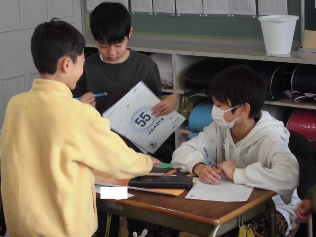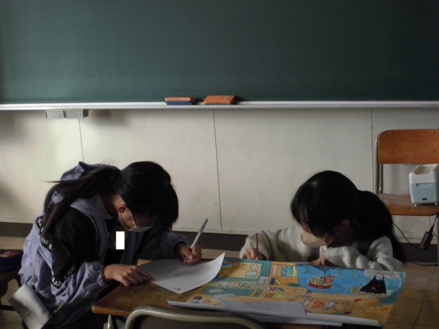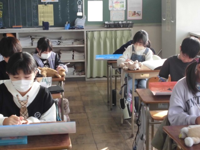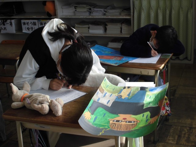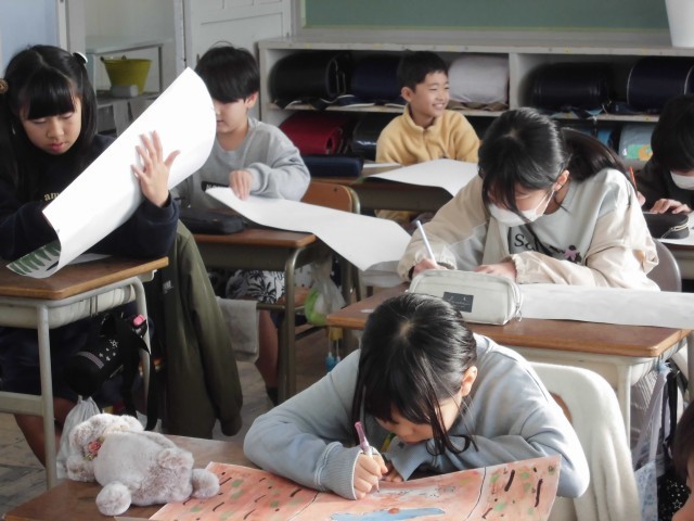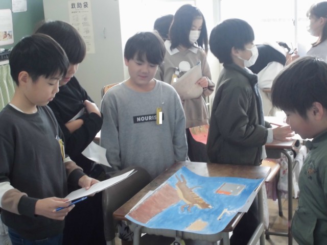 4年生は指定課題図書のお話をきいて、読書感想画を描きました。前回の授業で作品が完成したので、今日は鑑賞会を行いました。友達の絵の工夫しているところや、取り入れてみたい表現技法などを記録することができました。