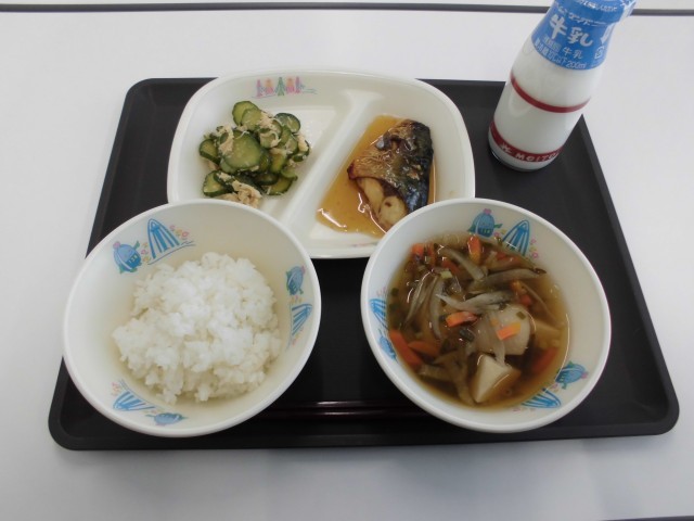 今日の献立は、ごはん、牛乳、さばの照り焼き、きゅうりのささみ和え、根菜汁です。