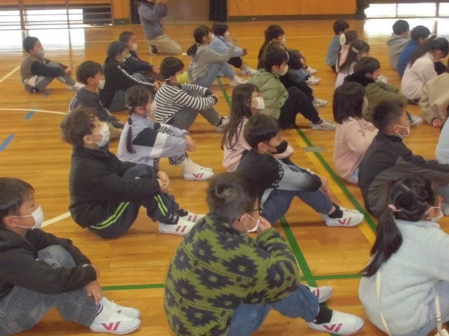 1年生は人権集会の様子です。人権擁護委員のお話を聞いています。