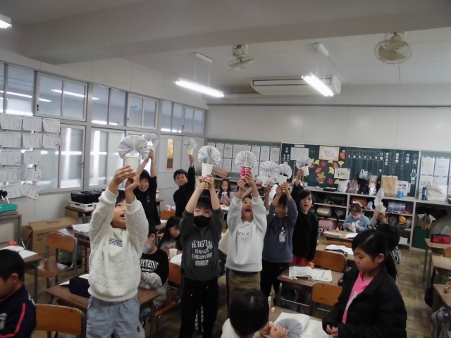 国語の説明文を読みながら、紙コップ花火を作りました。きれいな花火があがりました。