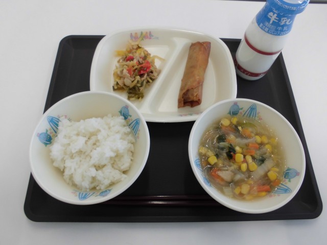 今日の献立は、ごはん、牛乳、チンジャオロース、春巻、はるさめスープです。