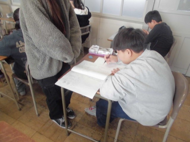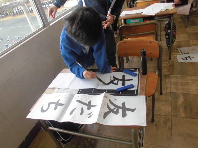 3年生は書写。書初め用の長い習字紙は学校の机では書きにくいですね。