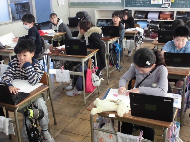 冬の植物や動物の様子について、Chromebookを使って調べ、ノートにまとめました。冬には、秋と比べて、気温や水温がさらに低くなるため、草が枯れたり、動物の姿が見られなくなったりすること、サクラやイチョウは葉が枯れ落ちても、木は枯れずに、枝に芽をつけて冬を越すことを学びました。