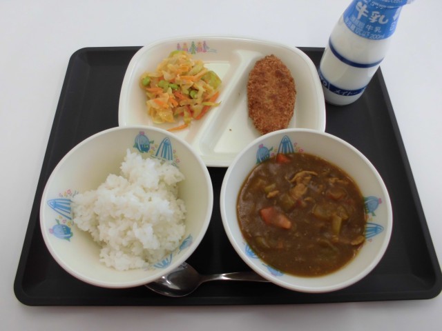 今日の献立は、ごはん、牛乳、ポークカレー、コーンフライ、野菜サラダです。