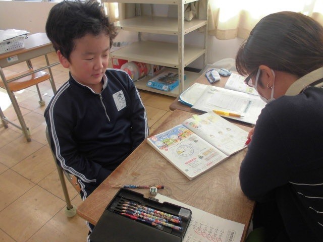 4年生は算数。答え合わせを待っているところです。全部あっていたかな?